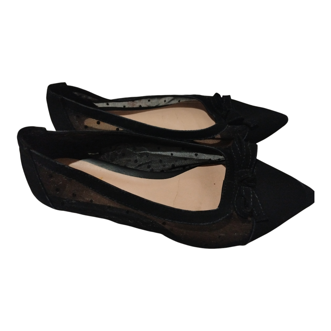 O modelo possui bico fino, laterais em tela transparente com poás, e detalhe frontal em laço delicado, trazendo um toque moderno e feminino ao mesmo tempo.